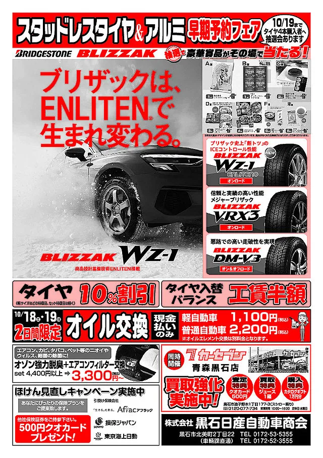 また、ブリヂストンタイヤ【C&Tタイヤショップ】として、タイヤアドバイザー資格を全員が取得済み。プロがタイヤのアドバイスをさせていただきますので、ご相談はお気軽に黒石市の黒石日産自動車商会までどうぞ。